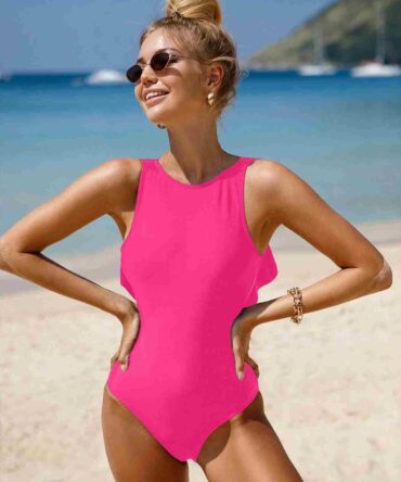 Traje de baño una pieza neón rosado ribete con fruncido de espalda abierta (sw2203287102122685)